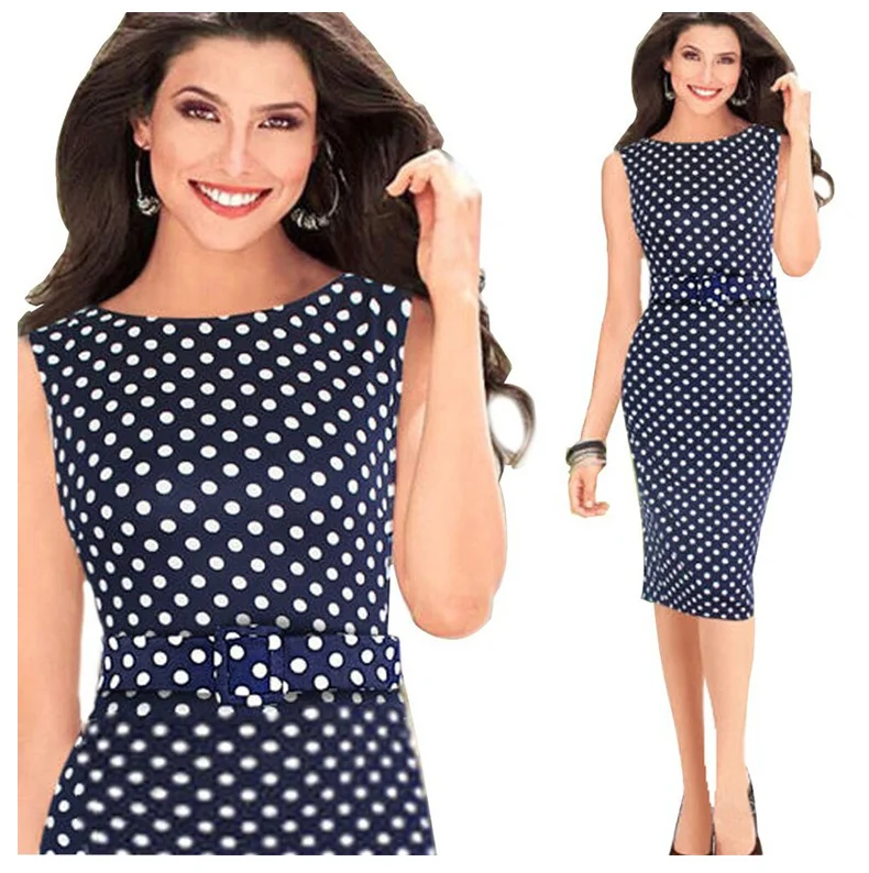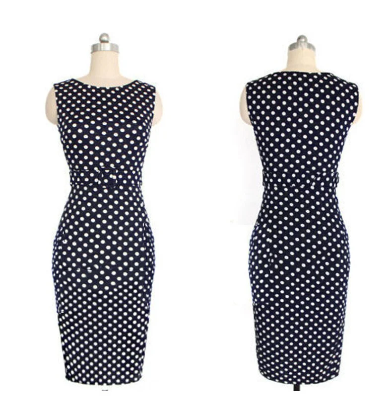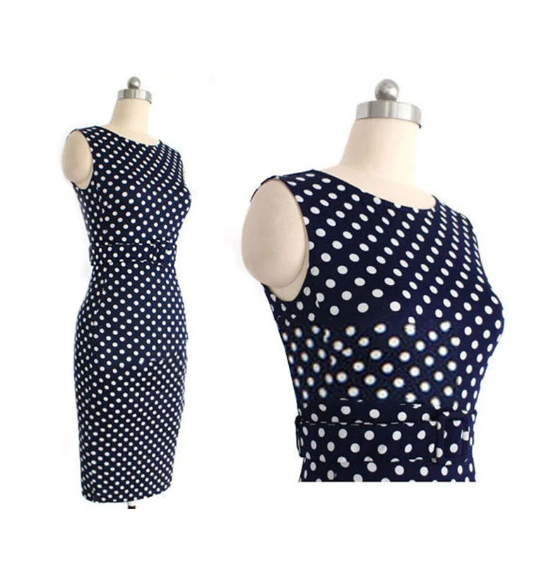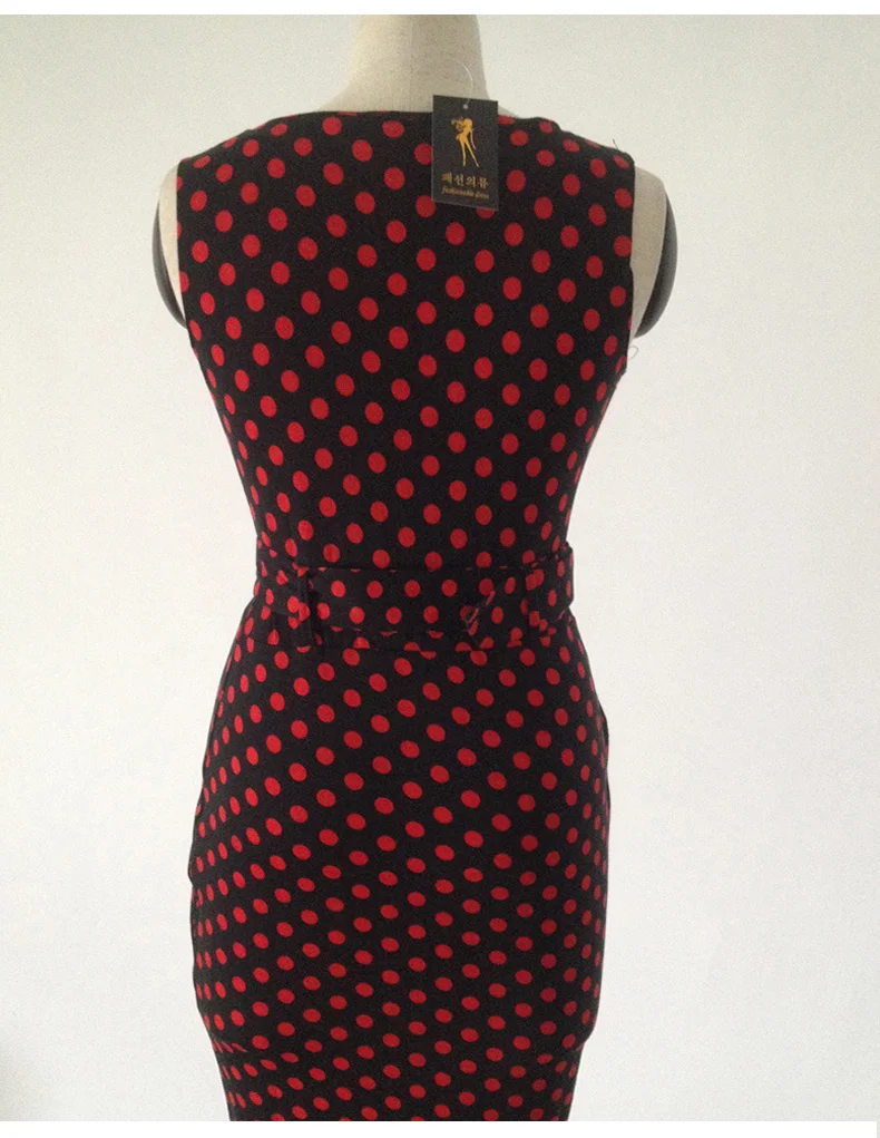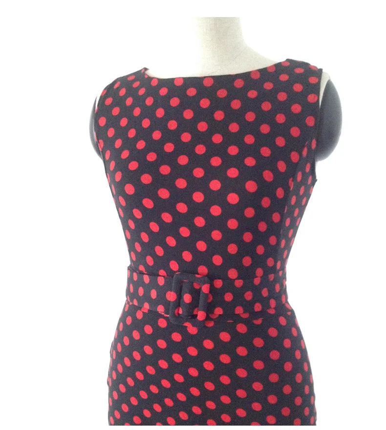 Manufacturer direct sale office lady officially dress slim fit dots printed sleeveless belted midi dress