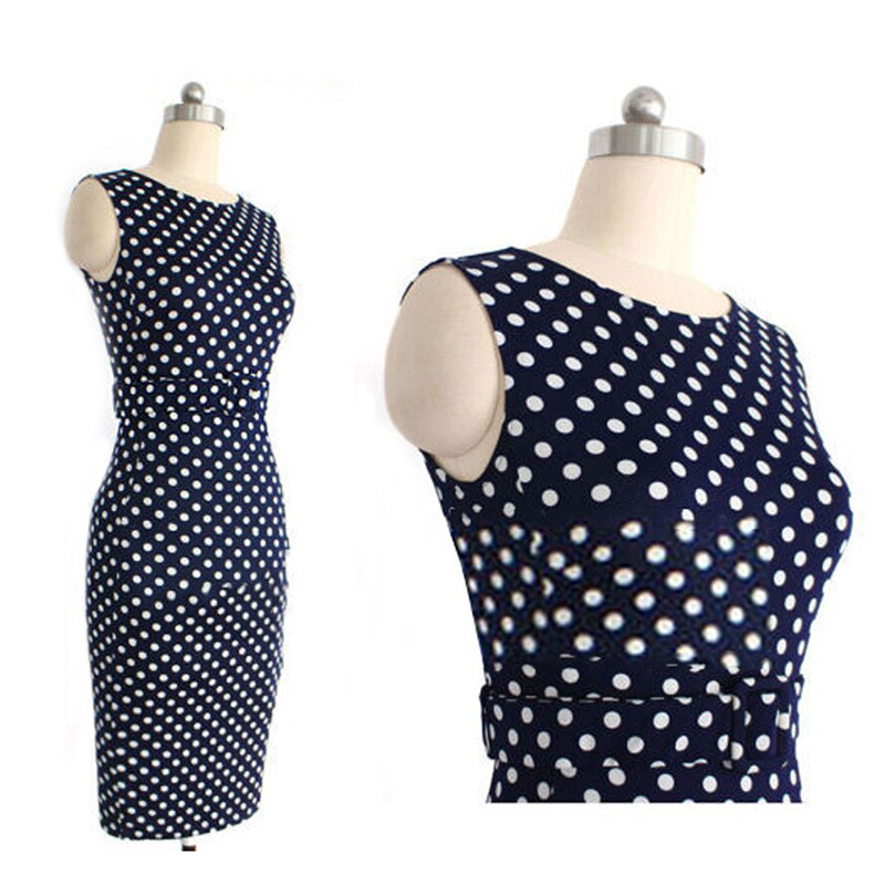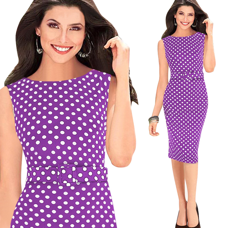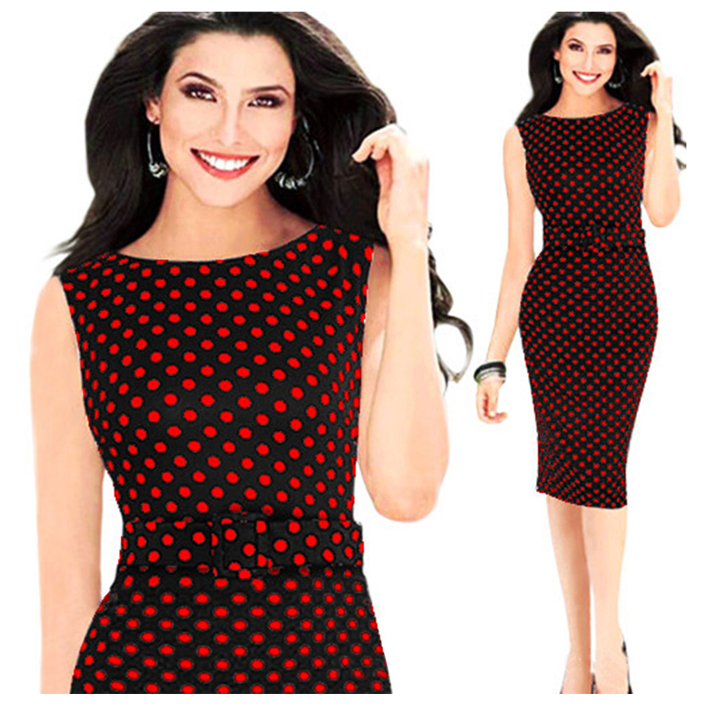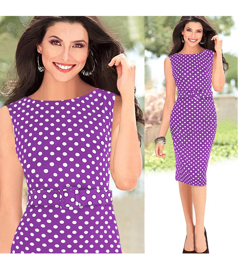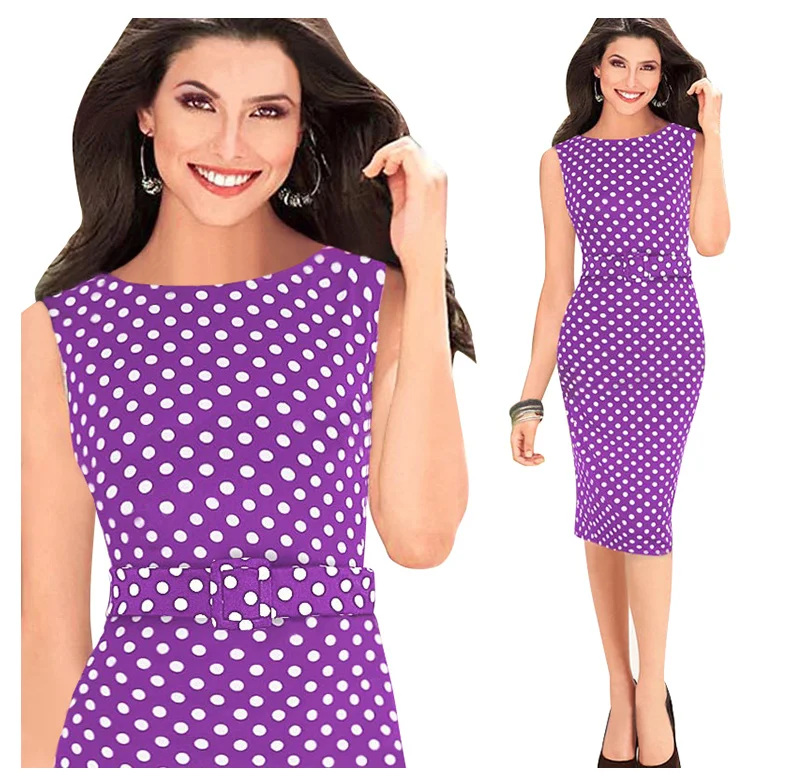 Manufacturer direct sale office lady officially dress slim fit dots printed sleeveless belted midi dress