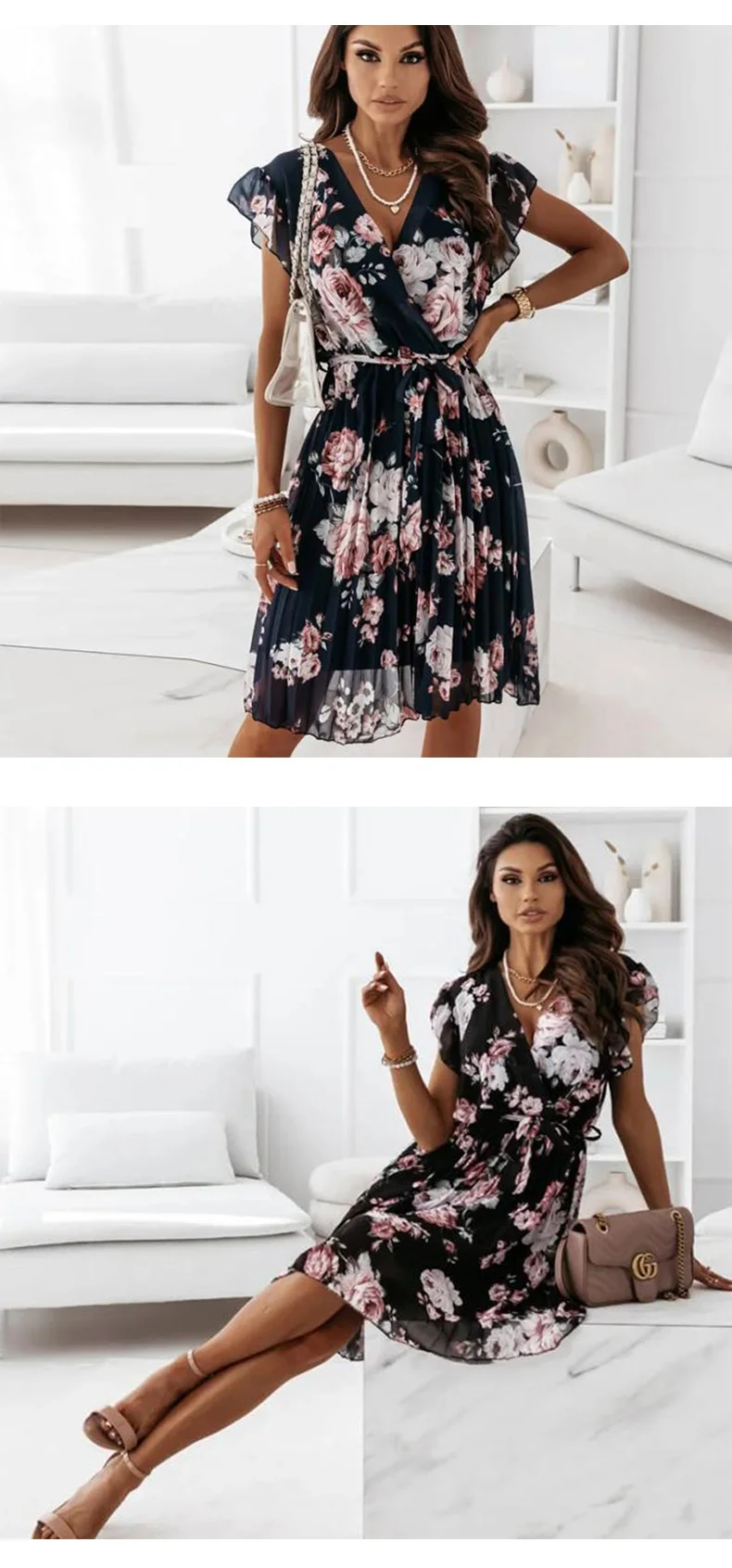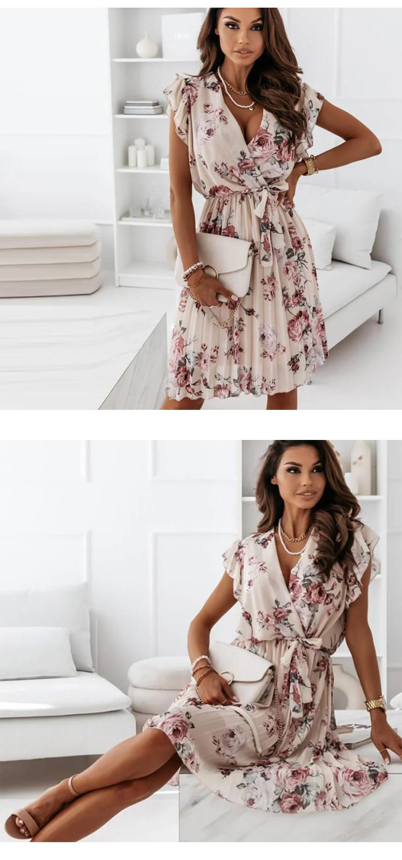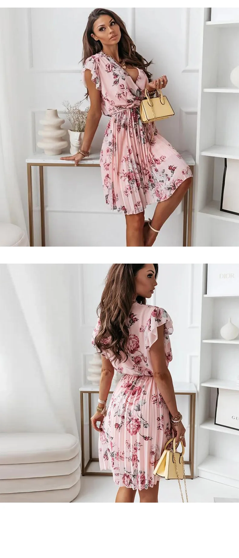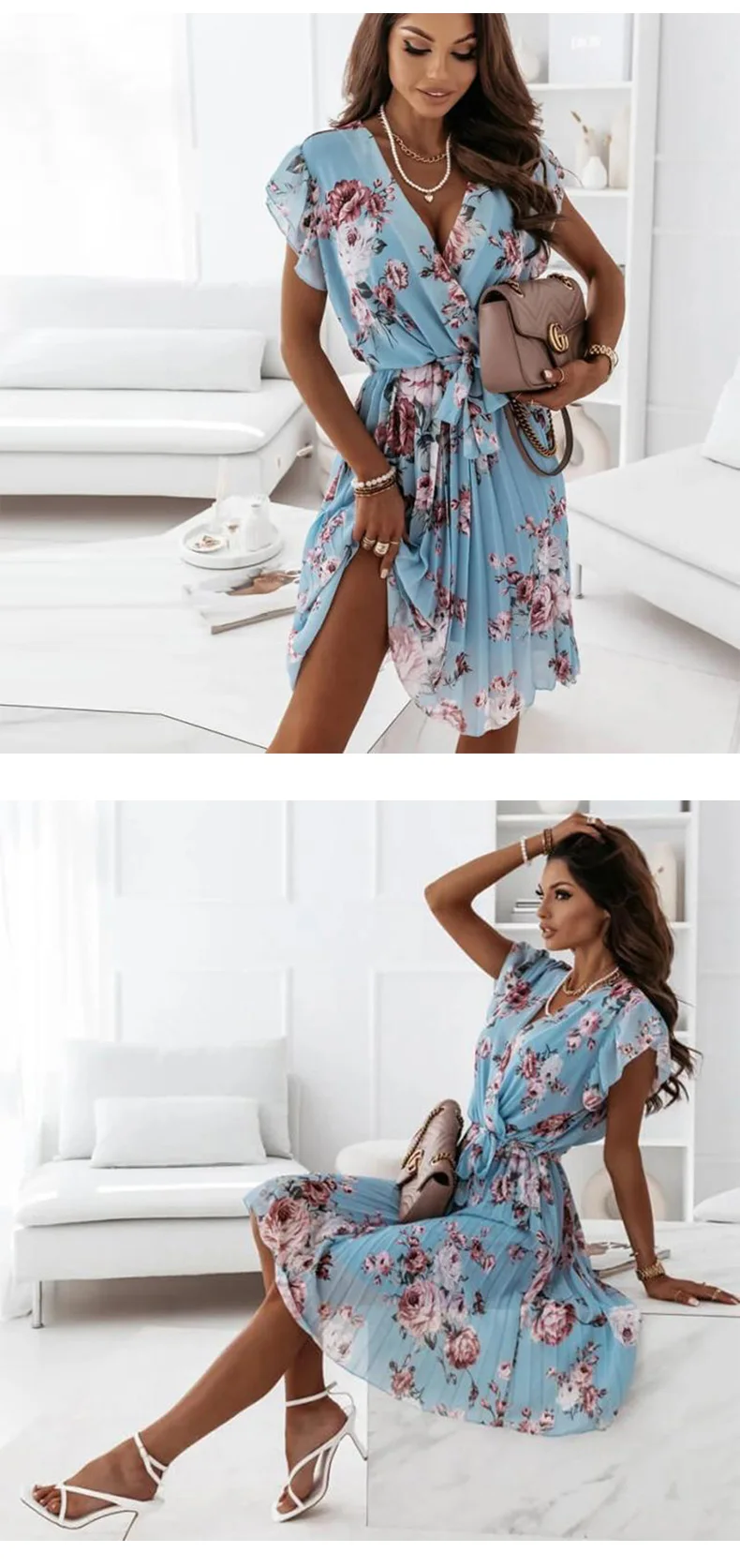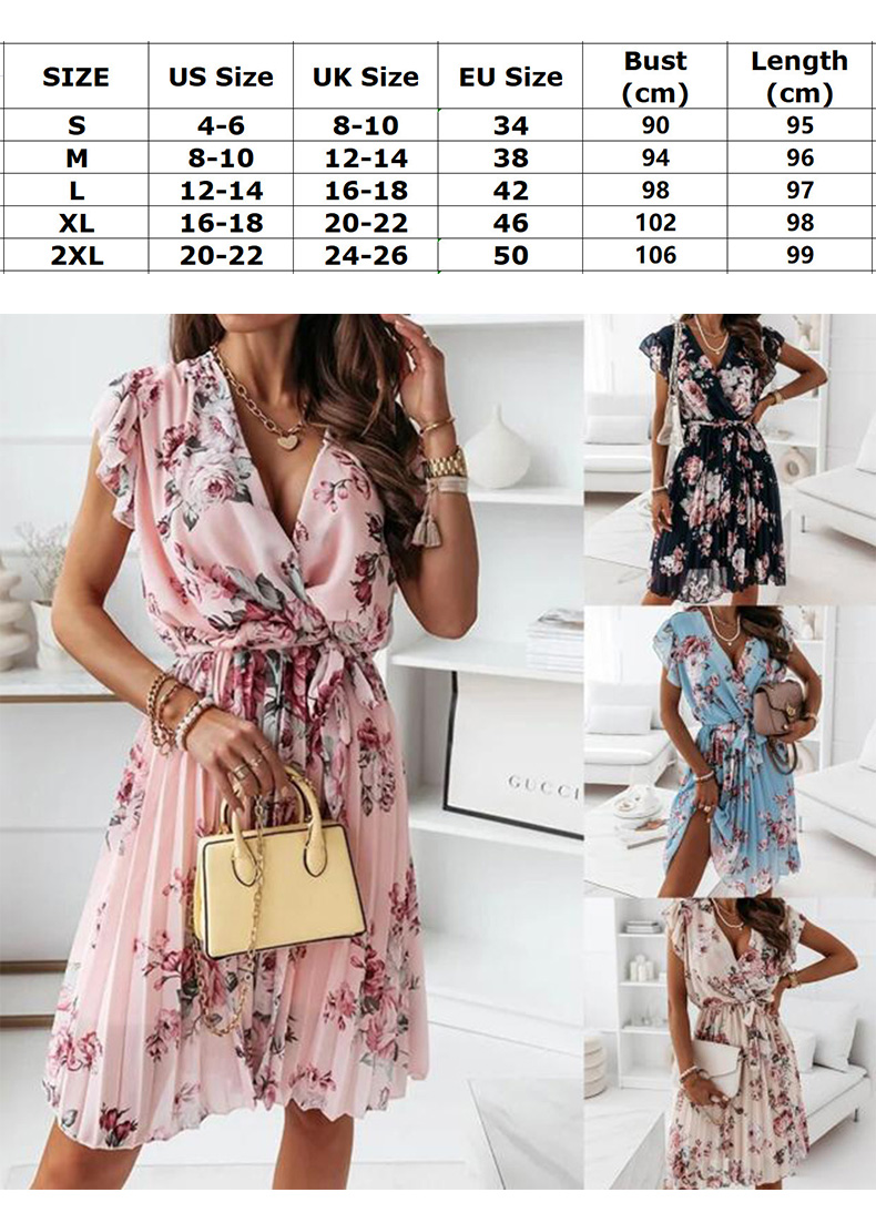 New Apparel Summer Ladies Sexy V-Neck Party Dress Women Elegant Floral Print Ruffle Dress A-Line Pleated Dress